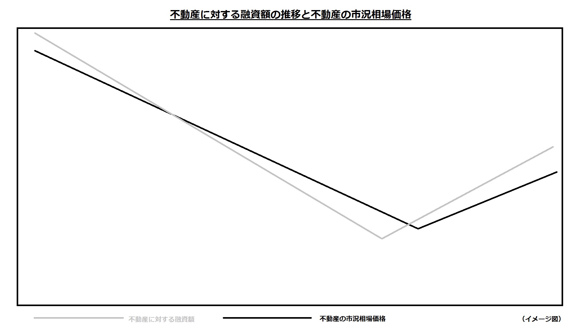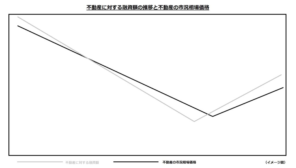 不動産価格の遅効性についてですが不動産の市況相場よりも先に不動産融資額が変動して融資額に引っ張られて市況相場が上下します。